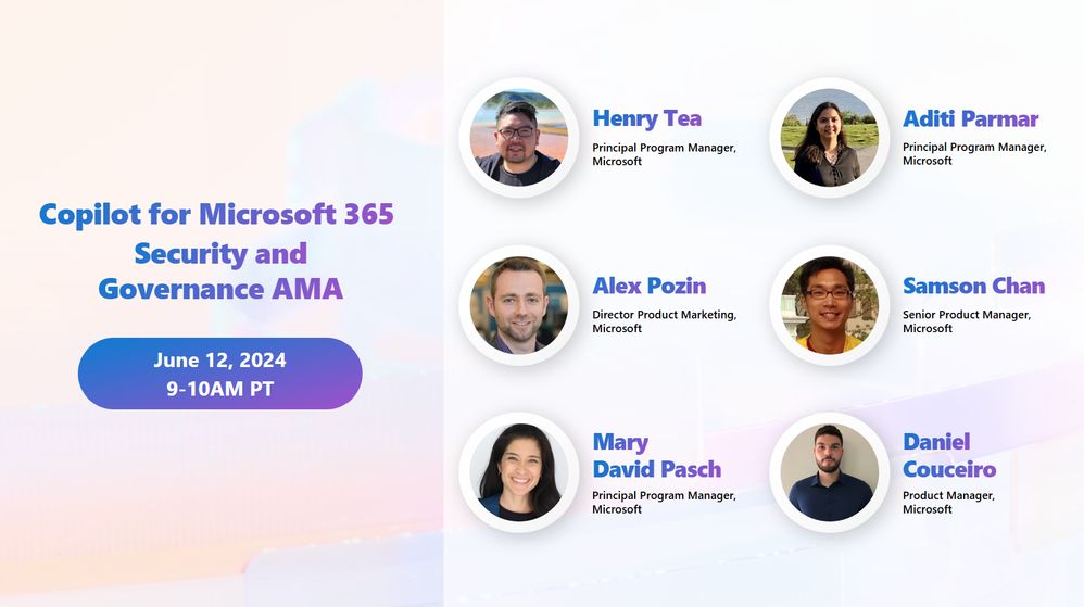 Join us for an exclusive Ask Me Anything (AMA) session focused on Security and Data Governance for Copilot for Microsoft 365 on Wednesday, June 12th, from 9:00 AM to 10:00 AM PST. This session will focus on pivotal topics such as Data Loss Prevention (DLP), eDiscovery, audit logs, restricted search, information barriers and data residency