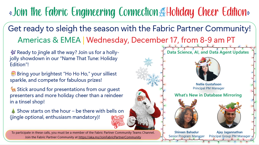 🎉 Holiday Cheer Alert! 🎶 Ready to jingle all the way with the Fabric Partner Community? Join us for our Fabric Engineering Connection - Holiday Cheer Edition!