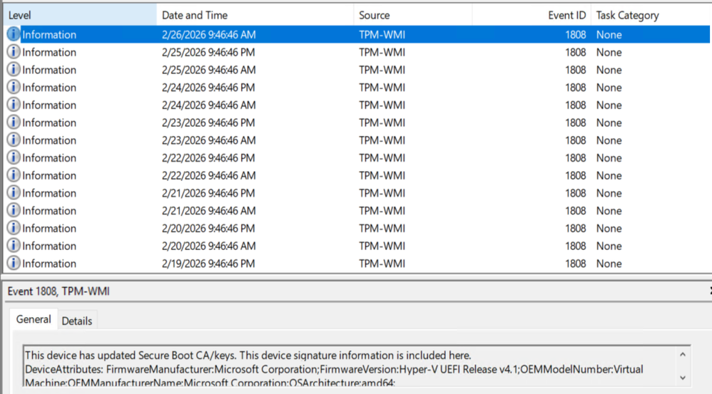 We observed Event ID 1808 on multiple servers, which indicates that the Secure Boot certificate has been successfully renewed and applied to the firmware.My question is: if Event ID 1808 confirms successful renewal, why are we still receiving the same event ID on a daily basis? Ideally, once the renewal is completed, this process should not continue to repeat.