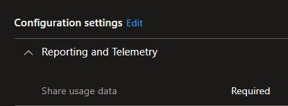 Configure Telemetry as part of a https://learn.microsoft.com/en-us/mem/intune/configuration/device-restrictions-configure for Windows 10 or later. In the device restriction profile, under Reporting and Telemetry, configure the Share usage data with a minimum value of Required. Values of Enhanced (1903 and earlier) or Optional are also supported.