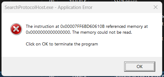 "The SearchProtocolHost.exe error "The instruction at 0x00007FF75424610B referenced memory at 0x0000000000000000. The memory could not be read,""