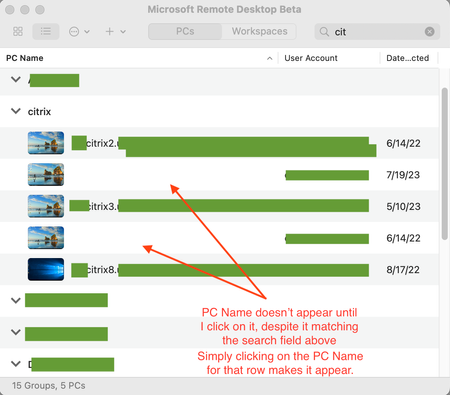 Mac - Microsoft Remote Desktop Beta This has been a bug through many iterations, and occurs on multiple Macs I use. Entering in a text search, correctly shows the results but some of the resu...