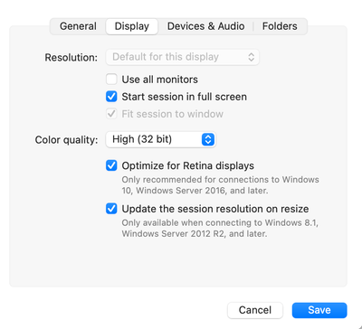 On the MacBook Pro 14" when connecting to RDP the desktop displayed cuts off about 20-30 pixels at top and bottom. The MacBook display is set to "Default for this Screen" btw This is a great app...