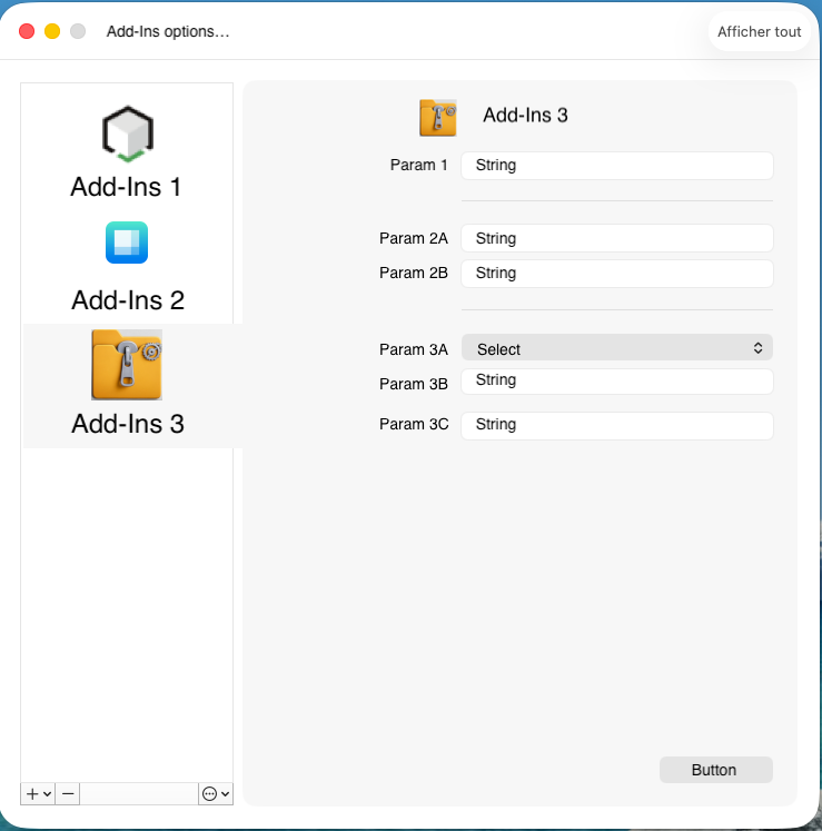 In the OptionsPane, the add-ins would be able to have an interface to configure its parameters (For example, for a Zip based add-ins, the user would be able to set the compression method or the default compression level).