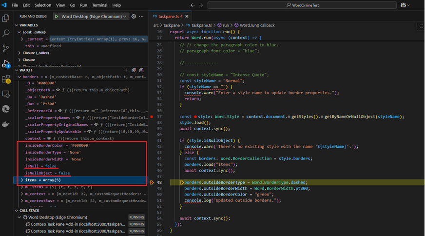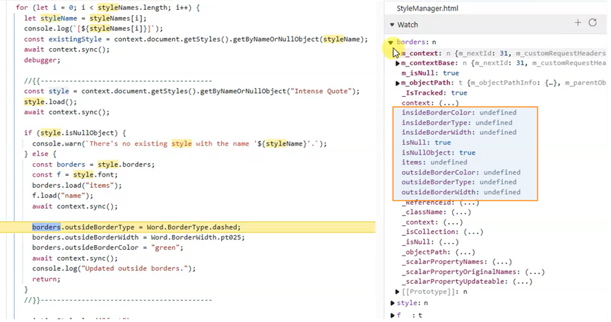 We are developing an Office Add-in that manipulates style border properties (e.g., outsideBorderType, outsideBorderWidth, and outsideBorderColor) to customize table and paragraph formatting in Word. Our testing shows that when running our code on the desktop version of Word these properties are populated and function as expected. However, when executing the same code in Word Online, the aforementioned border properties remain undefined.