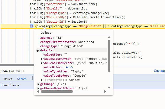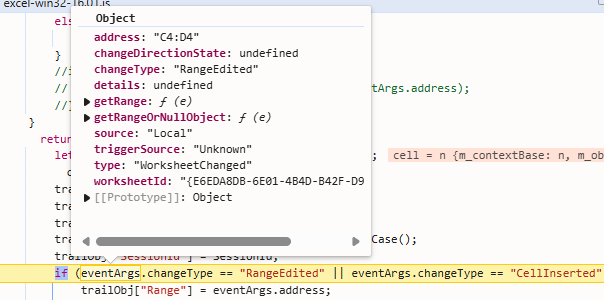 I am using the Worksheet.OnChanged event in office.js to capture valueBefore and valueAfter for cell changes. When I change a single cell, the event provides the details object with changeType: "RangeEdited" along with valueBefore and valueAfter.
