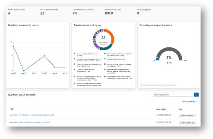 Weβre excited to introduce a new capability on Microsoft Q&A that provides contributors with greater visibility into their activity and impact.