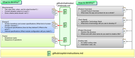 What Is Disciplined Guardrail-Based Development? In AI-assisted software development, approaches like Vibe Coding—which prioritize momentum and intuition—often fail to ensure code quality and maintainability. To address this, Disciplined Guardrail-Based Development introduces structured rules ("guardrails") that guide AI systems during coding and maintenance tasks, ensuring consistent quality and reliability. To get AI (LLMs) to generate appropriate code, developers must provide clear and specific instructions. Two key elements are essential: What to build – Clarifying requirements and breaking down tasks How to build it – Defining the application architecture The way these two elements are handled depends on the development methodology or process being used. Here are examples as follows. How to Set Up Disciplined Guardrails in GitHub Copilot To implement disciplined guardrail-based development with GitHub Copilot, two key configuration features are used: 1. Custom Instructions (.github/copilot-instructions.md): This file allows you to define persistent instructions that GitHub Copilot will always refer to when generating code. Purpose: Establish coding standards, architectural rules, naming conventions, and other quality guidelines. Best Practice: Instead of placing all instructions in a single file, split them into multiple modular files and reference them accordingly. This improves maintainability and clarity. Example Use: You might define rules like using camelCase for variables, enforcing error boundaries in React, or requiring TypeScript for all new code. https://docs.github.com/en/copilot/how-tos/configure-custom-instructions/add-repository-instructions 2. Chat Modes (.github/chatmodes/*.chatmode.md): These files define specialized chat modes tailored to specific tasks or workflows. Purpose: Customize Copilot’s behavior for different development contexts (e.g., debugging, writing tests, refactoring). Structure: Each .chatmode.md file includes metadata and instructions that guide Copilot’s responses in that mode. Example Use: A debug.chatmode.md might instruct Copilot to focus on identifying and resolving runtime errors, while a test.chatmode.md could prioritize generating unit tests with specific frameworks. https://code.visualstudio.com/docs/copilot/customization/custom-chat-modes The files to be created and their relationships are as follows. Next, there are introductions for the specific creation method. #1: Custom Instructions With custom instructions, you can define commands that are always provided to GitHub Copilot. The prepared files are always referenced during chat sessions and passed to the LLM (this can also be confirmed from the chat history). An important note is to split the content into several files and include links to those files within the .github/copilot-instructions.md file. Because it can become too long if everything is written in a single file. There are mainly two types of content that should be described in custom instructions: A: Development Process (≒ outcome + Creation Method) What documents or code will be created: requirements specification, design documents, task breakdown tables, implementation code, etc. In what order and by whom they will be created: for example, proceed in the order of requirements definition → design → task breakdown → coding. B: Application Architecture How will the outcome be defined in A be created? What technology stack and component structure will be used? A concrete example of copilot-instructions.md is shown below. # Development Rules ## Architecture - When performing design and coding tasks, always refer to the following architecture documents and strictly follow them as rules. ### Product Overview - Document the product overview in `.github/architecture/product.md` ### Technology Stack - Document the technologies used in `.github/architecture/techstack.md` ### Coding Standards - Document coding standards in `.github/architecture/codingrule.md` ### Project Structure - Document the project directory structure in `.github/architecture/structure.md` ### Glossary (Japanese-English) - Document the list of terms used in the project in `.github/architecture/dictionary.md` ## Development Flow - Follow a disciplined development flow and execute the following four stages in order (proceed to the next stage only after completing the current one): 1. Requirement Definition 2. Design 3. Task Breakdown 4. Coding ### 1. Requirement Definition - Document requirements in `docs/[subsystem_name]/[business_name]/requirement.md` - Use `requirement.chatmode.md` to define requirements - Focus on clarifying objectives, understanding the current situation, and setting success criteria - Once requirements are defined, obtain user confirmation before proceeding to the next stage ### 2. Design - Document design in `docs/[subsystem_name]/[business_name]/design.md` - Use `design.chatmode.md` to define the design - Define UI, module structure, and interface design - Once the design is complete, obtain user confirmation before proceeding to the next stage ### 3. Task Breakdown - Document tasks in `docs/[subsystem_name]/[business_name]/tasks.md` - Use `tasks.chatmode.md` to define tasks - Break down tasks into executable units and set priorities - Once task breakdown is complete, obtain user confirmation before proceeding to the next stage ### 4. Coding - Implement code under `src/[subsystem_name]/[business_name]/` - Perform coding task by task - Update progress in `docs/[subsystem_name]/[business_name]/tasks.md` - Report to the user upon completion of each task Note: The only file that is always sent to the LLM is `copilot-instructions.md`. Documents linked from there (such as `product.md` or `techstack.md`) are not guaranteed to be read by the LLM. That said, a reasonably capable LLM will usually review these files before proceeding with the work. If the LLM does not properly reference each file, you may explicitly add these arch