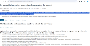 Good morning, The organization I work for has been developing a Maui-Blazor hybrid application. We were able to install it and it was working through our deployment process when we were using .Net 6.0. After the upgrade to .Net 8.0, it will no longer run on some of the machines. We are using Panasonic CF-33 toughbooks with the same clones on them. They have the same hardware specs. We have tried completely uninstalling the application, we've removed any runtimes from .Net and then did complete reinstalls of the runtimes. We've installed .Net Desktop Runtime and the .Net 8 runtime. We've reinstalled the application. There are no errors in the event viewer when we launch the application. When the application is launched from the start menu (either as admin or regular) the cursor spins for a moment and nothing happens. We've added logging in the startup pipeline of the application after we initially documented this behavior and deployed that and it's not even getting to the logging to log anything. Occassionally we get a kernelbase.dll error in the event viewer when launching but it's not consistently there. Some of the machines it opens on and some it doesn't. We are unable to find any discrepancies between the devices ie, same release of windows 10, same runtimes, etc. I would appreciate if anyone could comment on this for some tips or maybe something we could try. I have noticed that through the various installs (incrementing version/release) there are several folders created in the WindowsApps folder that are for the previous versions even if we have uninstalled them. We thought maybe that could be causing a problem. Thanks for your time and hope to hear from someone soon. Have a great day!748Views0likes2CommentsMoved auth db from localdb to mssql now I get a cert error