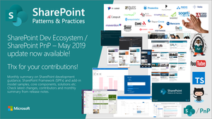 SharePoint Patterns and Practices (PnP) - PnP Core, PnP PowerShell and provisioning engine Special Interest Group (SIG) bi-weekly call recording from the 22nd of March meeting is now available from PnP YouTube channel at http://aka.ms/sppnp-videos. Presentation is available from the PnP docs at http://aka.ms/sppnp-docs. Topics covered on 22nd of March 2017 March 2017 release and roadmap - 4:25 DEMO - PnP PowerShell and Azure Functions by John Liu - 8:19 SharePoint Online User interface compatibility for "modern" experiences - 40:39 DEMO - User Interface Experience Scanner (at GitHub) - 48:52 Open Q&A - 59:38 PnP Core Component, PnP PowerShell and provisioning engine Special Interest Group bi-weekly calls are targeted for anyone who are interested on the PnPCorecomponent and PnP PowerShell capabilities in SharePoint Online and in SharePoint on-premises. You can download recurrent invite from http://aka.ms/SPPnP-Core-SIG-Call. Welcome and join the discussion. If you have any questions, comments or feedback, feel free to provide your input as comments to this post as well.2KViews6likes1CommentSharePoint Dev Ecosystem / SharePoint PnP - May 2019 update now available