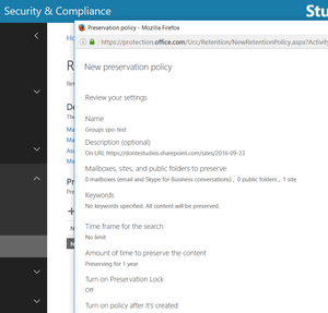 Tried configuring a Preservation Hold on a SharePoint Url belonging to a Group to see if that could be a way to protect documents/files from beeing deleted from a Group and if that would stop the group from beeing deleted by an Owner. It seems to have worked half-way, deleting/modifying items creates a copy of the file in the PreservationHoldLibrary where it's read-only. But it still possible to delete the Group from the Outlook-UI and it results in a orphaned SharePoint site that I cant access (gives 403) and not take ownership of using for example PowerShell (Get-SPOSite -Identity https://doritestudios.sharepoint.com/sites/2016-09-23 | Set-SPOSite -Owner myname@doritestudios.se results in an Microsoft.Online.SharePoint.Common.SpoException) :-( It seems that I still can do eDiscovery searches to get the items out from the site so that could be a way of getting the files out of the site later on. Is it only the Exchange Mailbox that is supported in Groups eDiscovery or is also SPO-sites supported? https://blogs.office.com/2015/12/09/office-365-groups-now-supports-ediscovery-litigation-hold-dynamic-membership-and-more/1.7KViews0likes1Comment