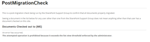 The attempted operation is prohibited because it exceeds the list view threshold enforced by the administrator. I have added a Relevant Documents web part added to a page. On 40+ sites, I have added this part on a similar page and no issues. One 1 site, I receive this error. I am a Farm Admin. The threshold cannot be the issue (it's set at 5000). The Relevant Documents web part (filtered to "Documents checked out to me") should show anywhere from 0-10 documents for a given site (and it does). On the problem site - it should show 1 checked out document - but I get the above error instead. The web part has no other settings configured beyond the default. other than the "Include documents checked out to me" (as opposed to "Included documents last modified by me"). I've tried upping the setting to allow 500 items be shown, but that made no difference. Appreciate any help.4.4KViews0likes10Comments