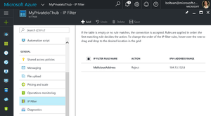 As more businesses turn to the Internet of Things (IoT), security and privacy are often top of mind. Our goal at Microsoft is to keep our customers' IoT solutions secure. As part of our ongoing security efforts, Microsoft recently launched the Security Program for Azure IoT, which provides customers with a choice of security auditors who can assess their IoT solutions from device to cloud. Microsoft also offers comprehensive guidance on IoT security and state of the art security built into Azure IoT Suite and Azure IoT Hub. Today, Microsoft is excited to announce another important security feature: IP filtering. IP filtering enables customers to instruct IoT Hub to only accept connections from certain IP addresses, to reject certain IP addresses or a combination of both. We’ve made it easy for administrators to configure these IP filtering rules for their IoT Hub. These rules apply any time a device or a back-end application is connecting on any supported protocols (currently AMQP, MQTT, AMQP/WS, MQTT/WS, HTTP/1). Any application from an IPv4 address that matches a rejecting IP rule receives an unauthorized 401 status code without specific mention of the IP rule in the message. The IP filter allows maximum 10 rules each rejecting or accepting an individual IPv4 address or a subnet using the CIDR-notation format. The following two examples demonstrate how to blacklist an IP address and whitelist a certain subnet. Read more on Azure Blogs for tutorials on how to Blacklist an IP address and Whitelist a Subnet.1.2KViews2likes0Comments