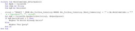 Hi I have a bit of a problem. I have a form with a date dropdown combo, "WeekCommCombo". After update I am trying to check in the table to see if there is a record with the date already in the table. if there is then display one message and if there isn't display the message "Run Query". However, when I run it it does nothing. Not even an error message. (Code below) Any ideas what I can get this to work? Thanks Aaron663Views0likes1CommentSharepoint 365 - Access Database