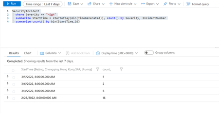 Hi, I would like to create a timechart for high daily number of incident in the past 7-day. However, not everyday has high incident. How could I fill the 0 into the result if that day has no high incident? I had the similar ticket before: https://techcommunity.microsoft.com/t5/microsoft-sentinel/barchart-when-the-returned-result-is-zero/m-p/3219799#M9144 I am not sure if i need to create the dynamic object for the past 7-day. Thanks. SecurityIncident | where Severity == "High" | summarize StartTime = startofday(min(TimeGenerated)), count() by Severity, IncidentNumber | summarize count() by bin(StartTime,1d)2.4KViews0likes4CommentsRun LogicApp from workbook