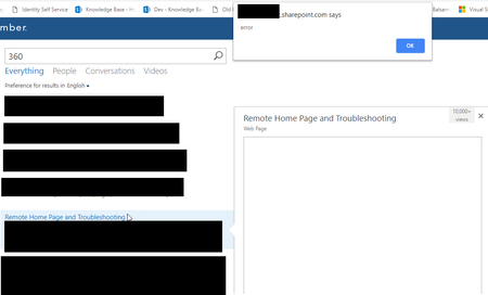 Hey everyone, I joined this org earlier this year and am getting around to building a custom search center, the site was a lift and shift from SP2010 to SPO prior to my starting here, and as a part of that, there a lot of random things I need to clean-up. This error pops up on the search results page, but I can't tell where it's coming from or what triggers it. It appears after mousing-over a result, as shown in the screenshot below. I've tried fiddler and Chrome dev tools to determine where this is coming from, but no luck yet. After clicking Ok, I do get the normal search results and no longer receive an error message for any of the results on this page. Thanks, Eric905Views0likes2CommentsPage Redirection