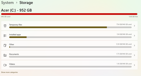 Hi, I am having problems with my acer aspire 5. I have very limited disk space and it says 700+gb are taken by temporary files: When I try to press on temporary files and clean it, it gives me like barely any files to clear: I have trawled this forum trying all the commands I can find but they're all making no difference! This is making my laptop unusable, any advice? TIA1View0likes0Comments