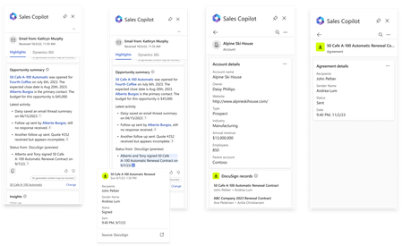 The integration of Sales Copilot and DocuSign allows sales teams to be more effective in customer engagements using the additional visibility they get on all agreement and agreement related activities in DocuSign presented contextually by Sales Copilot when engaging with customers on emails in Outlook.