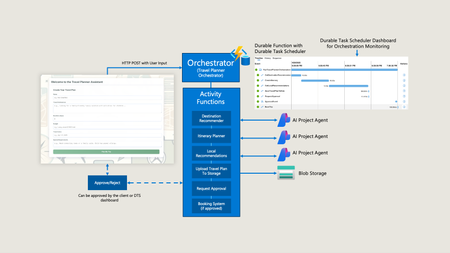 Durable Execution Durable Execution is a reliable approach to running code, designed to handle failures smoothly with automatic retries and state persistence. It is built on three core principles: Incremental Execution: Each operation runs independently and in order. State Persistence: The output of each step is durably saved to ensure progress is not lost. Fault Tolerance: If a step fails, the operation is retried from the last successful step, skipping previously completed steps. Durable Execution is particularly beneficial for scenarios requiring stateful chaining of operations, such as order-processing applications, data processing pipelines, ETL (extract, transform, load), and as we'll get into in this post, intelligent applications with AI agents. Durable execution simplifies the implementation of complex, long-running, stateful, and fault-tolerant application patterns. Technologies like Durable Functions provide a programming model that makes the implementation of these patterns straightforward. Some common stateful application patterns that require stateful chaining and are easily implemented with durable execution, like Durable Functions include: Durable Task Programming Model Before solutions like Azure Durable Functions, developers had to manually coordinate operations and maintain state using infrastructure like message queues and state stores, adding complexity to the code and increased the operational maintenance burden. Durable Functions streamlines this process by providing a programming model backed by a durable state store, enabling developers to define a series of steps to be executed in a specific order. This is called an orchestrator function. Activity functions within the orchestration function are the "steps," and the durable task runtime ensures each step is scheduled in order and executed on your compute of choice, with outputs persisted. Durable for Orchestrating Agents With the rapid advancements in AI, we are witnessing an increasing trend of scenarios that require orchestration, specifically when it comes to working with multiple AI agents within applications. These agents often work together to accomplish a larger task. Two emerging designs for these applications are deterministic agentic workflows and self-directed agentic workflows: Deterministic Agentic Workflows: Agents work together through a series of predefined steps to accomplish a larger task, leading to a deterministic result. A Deterministic Agentic Workflow orchestrates a series of predefined steps, each calling sub-agents to achieve a deterministic outcome. Self-Directed Agentic Workflows: Agents dynamically explore and determine the workflow plan as they proceed. Each approach fits different business scenarios and requirements. However, as we're learning, many scenarios benefit from deterministic outcomes, and durable execution truly shines in the deterministic agentic workflow pattern. It excels at providing efficient and reliable deterministic outcomes by following a predefined set path that maps to orchestration and activity functions. The programming model makes it extremely easy to call your agents independently and implement common agent app patterns, such as prompt chaining for function chaining and parallelization with fan-out/fan-in. For more on this, please reference this insightful blog post by my colleague Chris Gillum. Self-directed agentic workflows are advantageous for unpredictable, creative tasks where the agents can determine their plan during execution. However, this can be less efficient and lead to non-deterministic outcomes, which may cause undesirable results. When using durable execution for your agent orchestration, it enhances the resiliency of your agentic workflows. If any step fails, there’s no need to start from the beginning. Given that requests to LLMs can be expensive and may yield different outcomes, durable execution ensures that your orchestrations can recover right from their last success point. Let’s look at a specific example of where I used durable execution, specifically Azure Durable Functions to implement a multi-agent application that requires durability – The Travel Planner Assistant. The Travel Planner Assistant Travel planning inherently follows a structured sequence – selecting destinations, crafting itineraries, gathering local insights, and booking the trip. This makes it ideal for an agentic workflow with predefined steps, rather than a self-directed agentic workflow with exploration. The outcome must be deterministic – we want a complete travel itinerary and a fully booked trip. The application exposes a durable function that schedules a predefined agentic workflow (orchestration) to create a travel plan, which will then be used to book the trip. The orchestration interacts with specialized sub-agents for the first three steps. These include: Destination Recommender Agent: Provides global knowledge across thousands of locations. Itinerary Planner Agent: Creates a daily itinerary based on a deep understanding of the specific location’s logistics and seasonal considerations. Local Recommendations Agent: Offers popular attractions to visit. Orchestration Activity Function Calls - Sequential AI agent activities. Each activity is executed as a separate function with its own context. By using Durable Functions to coordinate these specialized agents, the travel planner agent creates a more accurate and comprehensive travel plan than a single generalist agent. Once the travel plan has been created, Durable Function orchestrations provide built-in support for human interaction, allowing human approval of the travel plan before proceeding to book the trip. This can be crucial in some scenario because, despite the advancements in agents and LLMs, there are still critical tasks that require human input. Relying solely on LLM decision-making without review for such important task can be risky, and human approval ensure accuracy and reliability.