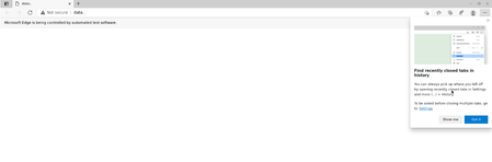 Most RecentMost ViewedMost LikesDisable startup popup "find recently closed tab" on edge 91 and 92 Hi folks, Since edge 91.0 and 92.0 I got a popup when I open Edge Chromium with selenium. Does someone know if there is a profile policy or a flag to disable it? Thanks