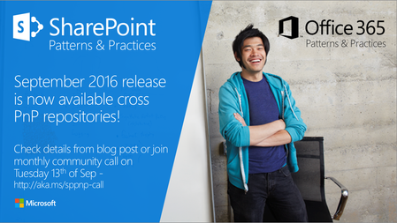 New PnP webcast concentrated on the options and considerations around using external JavaScipt libraries within your SharePoint Framework client-side web part. Check following blog post from dev.office.com/blogs for more details. SharePoint PnP Webcast – Referencing external JavaScript libraries from client-side web part If you have any comments, feedback or other thoughts, just let us know.1.2KViews10likes1CommentSharePoint / Office 365 Dev Patterns and Practices - September 2016 release