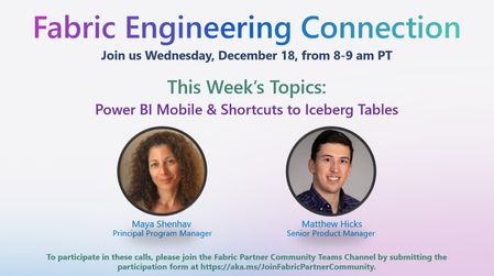 Join us this Wednesday, September 11, from 8-9 AM PT for the weekly partner community call, Fabric Engineering Connection! This week's call will feature presentations on Data Warehouse and Business Intelligence from Joanna Podgoetsky, Sujata Narayana, and Amanda Rivera. The Fabric Engineering Connection is a weekly call held in the Fabric Partner Community Teams Channel exclusively for partners. Hear directly from Fabric product engineering teams about upcoming features, ask questions, and provide feedback. To join these calls (as well as watch recordings of previous calls), please join the Fabric Partner Community Teams Channel by completing the participation form at https://aka.ms/JoinFabricPartnerCommunity.161Views0likes0CommentsJoin the Fabric Partner Community for this Week's Fabric Engineering Connection!