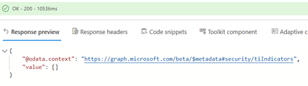 Hello Community, I have a Sentinel system with about 30K of TI indicators, that were ingested from Alien Vault using this playbook: Azure-Sentinel/Playbooks/Get-AlienVault_OTX at master ยท Azure/Azure-Sentinel (github.com). Now I would like to get a list of all indicators using Graph API. I tried to do it using Graph Explorer with the following query: GET https://graph.microsoft.com/beta/security/tiIndicators And I got the following response: After that, I tried to add a new indicator using Graph API: POST https://graph.microsoft.com/beta/security/tiIndicators and a request body from this example: Create threat intelligence indicator - Microsoft Graph beta | Microsoft Docs Then I did the first step of getting the list of existing indicators and I did see the indicator that was added manually. I went to Sentinel TI to check whether I see this manually added indicator or not there and I did see it. So my question is the following: Has anyone tried GraphAPI for TI indicators? What am I missing? Why don't I see all my indicators? It is in beta now, but It seems weird that the GET request shows nothing.1.5KViews0likes1CommentGraph API for Microsoft Secure Score Recommended actions