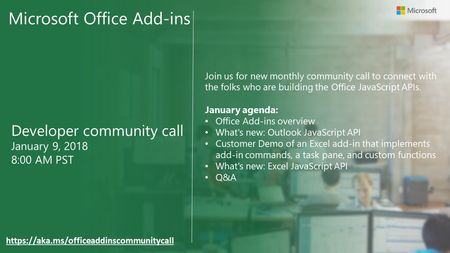 I have been trying for many months to develop : an Outlook web add-in using AngularJs. when the user clicks a button on the ribbon bar (not compose or read frame) an asynch dialog is launched, using displayDialogAsync() I have found many demos which have on or more of those requirements, but not which fits them all 😞 Really, I don't care too much about what I consider to be "just the framework" (no offence intended), I just want to drop my AngaulrJs app into that asynch dialog. Does anyone know where I can find a demo which ticks all of those boxes, which I can eviscerate and drop my won code into?748Views0likes0CommentsOffice Add-ins developer community call, January 9th at 8:00am PST