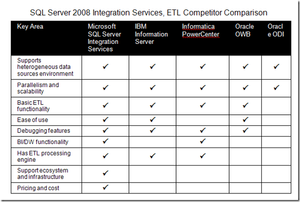 First published on MSDN on Aug 19, 2008 Did you know about this white paper comparing SSIS to IBM Information Server (DataStage), Informatica PowerCenter, Oracle Warehouse Builder, and Oracle Data Integrator? I had heard rumors of its existence, but I hadn’t actually seen the links for it until now.