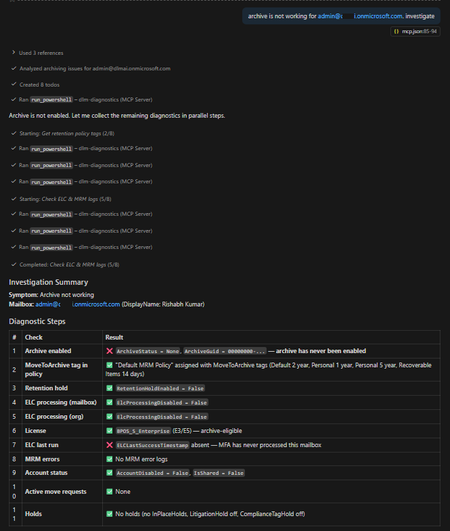Announcing the DLM Diagnostics MCP Server! Microsoft Purview Data Lifecycle Management (DLM) policies are critical for meeting compliance and governance requirements across Microsoft 365 workloads. However, when something goes wrong – such as retention policies not applying, archive mailboxes not expanding, or inactive mailboxes not getting purged – diagnosing the issue can be challenging and time‑consuming. To simplify and accelerate this process, we are excited to announce the open‑source release of the DLM Diagnostics Model Context Protocol (MCP) Server, an AI‑powered diagnostic server that allows AI assistants to safely investigate Microsoft Purview DLM issues using read‑only PowerShell diagnostics. GitHub repository: https://github.com/microsoft/purview-dlm-mcp The troubleshooting challenge When you notice issues such as: “Retention policy shows Success, but content isn’t being deleted” “Archiving is enabled, but items never move to the archive mailbox” The investigation typically involves: Connecting to Exchange Online and Security & Compliance PowerShell sessions Running 5–15 diagnostic cmdlets in a specific order Interpreting command output using multiple troubleshooting reference guides (TSGs) Correlating policy distribution, holds, archive configuration, and workload behavior Producing a root‑cause summary and recommended remediation steps This workflow requires deep familiarity with DLM internals and is largely manual. Introducing the DLM Diagnostics MCP Server The DLM Diagnostics MCP Server automates this diagnostic workflow by allowing AI assistants – such as GitHub Copilot, Claude Desktop, and other MCP‑compatible clients – to investigate DLM issues step by step. An administrator simply describes the symptom in natural language. The AI assistant then: Executes read‑only PowerShell diagnostics Evaluates results against known troubleshooting patterns Identifies likely root causes Presents recommended remediation steps (never executed automatically) Produces a complete audit trail of the investigation All diagnostics are performed under a strict security model to ensure safety and auditability. What is the Model Context Protocol (MCP)? The Model Context Protocol (MCP) is an open standard that enables AI assistants to interact with external tools and data sources in a secure and structured way. You can think of MCP as a “USB port for AI”: Any MCP‑compatible client can connect to an MCP server The server exposes well‑defined tools The AI can use those tools safely and deterministically The DLM Diagnostics MCP Server exposes Purview DLM diagnostics as MCP tools, enabling AI assistants to run PowerShell diagnostics, retrieve execution logs, and surface Microsoft Learn documentation. More information: https://modelcontextprotocol.io Diagnostic tools exposed by the server The server exposes four MCP tools. 1. Run read‑only PowerShell diagnostics This tool executes PowerShell commands against Exchange Online and Security & Compliance sessions using a strict allow list. Only read‑only cmdlets are permitted: Allowed verbs: Get-*, Test-*, Export-* Blocked verbs: Set-*, New-*, Remove-*, Enable-*, Invoke-*, and others Every command is validated before execution. Example: Archive mailbox not working Admin: “Archiving is not working for john.doe@contoso.com” The AI follows the archive troubleshooting guide: 1 Step 1 – Check archive mailbox status 2 Get-Mailbox -Identity john.doe@contoso.com | 3 Format-List ArchiveStatus, ArchiveState 4 5 Step 2 – Check archive mailbox size 6 Get-MailboxStatistics -Identity john.doe@contoso.com -Archive | 7 Format-List TotalItemSize, ItemCount 8 9 Step 3 – Check auto-expanding archive 10 Get-Mailbox -Identity john.doe@contoso.com | 11 Format-List AutoExpandingArchiveEnabled Finding The archive mailbox is not enabled. Recommended action (not executed automatically): 1 Enable-Mailbox <user mailbox> –Archive All remediation steps are presented as text only for administrator review. 2. Retrieve the execution log Every diagnostic session is fully logged, including: Command executed Timestamp Duration Status Output Admins can retrieve the complete investigation as a Markdown‑formatted audit trail, making it easy to attach to incident records or compliance documentation. 3. Microsoft Learn documentation lookup If a question does not match a diagnostic scenario – such as “How do I create a retention policy?” – the server falls back to curated Microsoft Learn documentation. The documentation lookup covers 11 Purview areas, including: Retention policies and labels Archive and inactive mailboxes eDiscovery Audit Communication compliance Records management Adaptive scopes 4. Create a GitHub issue (create_issue) create_issue lets the assistant open a feature request in the project’s GitHub repo and attach key session details (such as the commands run and any failures) to help maintainers reproduce and prioritize the request. Example: File a feature request from a failed diagnostic ✅ Created GitHub issue #42 Title: Allowlist should allow Get-ComplianceTag cmdlet Category: feature request Labels: enhancement URL: https://github.com/microsoft/purview-dlm-mcp/issues/42 Session context included: 3 commands executed, 1 failure Security and safety model Security is enforced at multiple layers: Read‑only allow list: Only approved diagnostic cmdlets can run No stored credentials: Authentication uses MSAL interactive sign‑in Session isolation: Each server instance runs in its own PowerShell process Full audit trail: Every command and result is logged No automatic remediation: Fixes are never executed by the server This design ensures diagnostics are safe to run even in sensitive compliance environments. Supported diagnostic scenarios The server currently includes 12 troubleshooting reference guides, covering common DLM issues such as: Retention policy shows Success but content is not retained or deleted Po