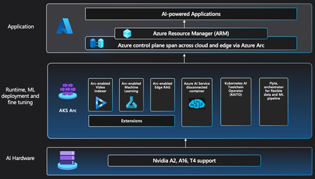 Overview Azure is the world’s AI supercomputer providing the most comprehensive AI capabilities ranging from infrastructure, platform services to frontier models. We’ve seen emerging needs among Azure customers to use the same Azure-based solution for AI/ML on the edge with minimized latencies while staying compliant with industry regulation or government requirement. Azure Kubernetes Service enabled by Azure Arc (AKS Arc) is a managed Kubernetes service that empowers customers to deploy and manage containerized workload whether they are in data centers or at edge locations. We want to ensure AKS Arc provides optimal experience for AI/ML workload on the edge, throughout the whole development lifecycle from AI infrastructure, Model deployment, Inference, Fine-tuning, and Application. AI infrastructure AKS Arc supports Nvidia A2, A16, and T4 for compute-intensive workload such as machine learning, deep learning, model training. When GPUs are enabled in Azure Local; AKS Arc customers can provision GPU node pools from Azure and host AI/ML workload in the Kubernetes cluster on the edge. For more details, please visit instructions from GPU Nodepool in AKS Arc. Model deployment and fine tuning Use KAITO for language model deployment, inference and fine tuning Kubernetes AI Toolchain Operator (KAITO) is an open-source operator that automates and simplifies the management of model deployments on a Kubernetes cluster. With KAITO, you can deploy popular open-source language models such as Phi-3 and Falcon, and host them in the cloud or on the edge. Along with the currently supported models from KAITO, you can also onboard and deploy custom language models following this guidance in just a few steps. AKS Arc has been validated with the latest KAITO operator via helm-based installation, and customers can now use KAITO in the edge to: Deploy language models such as Falcon, Phi-3, or their custom models Automate and optimize AI/ML model inferencing for cost-effective deployments, Fine-tune a model directly in a Kubernetes cluster, Perform parameter efficient fine tuning using low-rank adaptation (LoRA) Perform parameter efficient fine tuning using quantized adaptation (QLoRA) You can get started by installing KAITO and deploying a model for inference on your edge GPU nodes with KAITO Quickstart Guidance. You may also refer to KAITO experience in AKS in cloud: Deploy an AI model with the AI toolchain operator (Preview) Use Arc-enabled Machine Learning to train and deploy models in the edge For customers who are already familiar with Azure Machine Learning (AML), Azure Arc-enabled ML extends AML in Azure and enables customers to target any Arc enabled Kubernetes cluster for model training, evaluation and inferencing. With Arc ML extension running in AKS Arc, customers can meet data-residency requirements by storing data on premises during model training and deploy models in the cloud for global service access. To get started with Arc ML extension, please view instructions from Azure Machine Learning document . In addition, AML extension can now be used for a fully automated deployment of a curated list of pre-validated language and traditional AI models to AKS clusters, perform CPU and GPU-based inferencing, and subsequently manage them via Azure ML Studio. This experience is currently in gated preview, please view another Ignite blog for more details. Use Azure AI Services with disconnected container in the edge Azure AI services enable customers to rapidly create cutting-edge AI applications with out-of-the-box and customizable APIs and models. It simplified the developer experience to use APIs and embed the ability to see, hear, speak, search, understand and accelerate decision-making into the application. With disconnected Azure AI service containers, customers can now download the container to an offline environment such as AKS Arc and use the same APIs available from Azure. Containers enable you to run Azure AI services APIs in your own environment and are great for your specific security and data governance requirements. Disconnected containers enable you to use several of these APIs disconnected from the internet. Currently, the following containers can be run in this manner: Speech to text Custom Speech to text Neural Text to speech Text Translation (Standard) Azure AI Vision - Read Document Intelligence Azure AI Language Sentiment Analysis Key Phrase Extraction Language Detection Summarization Named Entity Recognition Personally Identifiable Information (PII) detection To get started with disconnected container, please view instructions at Use Docker containers in disconnected environments . Build and deploy data and machine learning pipelines with Flyte Flyte is an open-source orchestrator that facilitates building production-grade data and ML pipelines. It is a Kubernetes native workflow automation tool. Customers can focus on experimentation and providing business value without being an expert in infrastructure and resource management. Data scientists and ML engineers can use Flyte to create data pipelines for processing petabyte-scale data, building analytics workflow for business or finance, or leveraging it as ML pipeline for industry applications. AKS Arc has been validated with the latest Flyte operator via helm-based installation, customers are welcome to use Flyte for building data or ML pipelines. For more information, please view instructions from Introduction to Flyte - Flyte and Build and deploy data and machine learning pipelines with Flyte on Azure Kubernetes Service (AKS). AI-powered edge applications with cloud-connected control plane Azure AI Video Indexer, enabled by Azure Arc Azure AI Video Indexer enabled by Arc enables video and audio analysis, generative AI on edge devices. It runs as Azure Arc extension on AKS Arc and supports many video formats including MP4 and other common formats. It also supports several languages in all basic audio-related models. The Phi 3 la