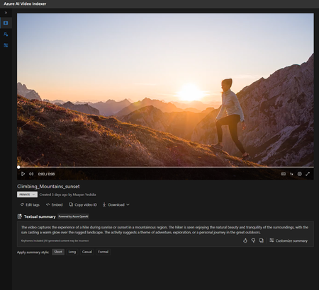 We are thrilled to introduce the Multi Modal Video Summarization, an enhancement to our previously introduced textual video summarization for recorded video and audio files. This new feature allows customers to obtain concise textual summaries of their videos by identifying key frames and processing them through a GenAI engine using Azure OpenAI or Phi3.5 model. By leveraging the Key frames as an input in addition to the audio and visual insights computed by Azure Video Indexer, prompts are generated to assist the language model in creating a comprehensive video summary. This multi modal approach, ensuring a more accurate and contextually rich summary, suitable for more use cases and scenarios. This feature is available both in the cloud, powered by Azure OpenAI, and on the Edge, as part of VI enabled by ARC, utilizing the latest Phi3.5 visual model that can be configured to run with GPUs for improved performance. Summary of a short video that had no audio, by applying key frames extraction as part of the Textual Summary using GPT4V. The Power of Keyframes By incorporating Video Indexer’s keyframe extraction technology, which captures key moments in the video, and combining them with other audio insights from the video indexer engine such as transcripts, special sounds like alarms or applause, and visual signals including Optical Character Recognition (OCR), object detection, labels, and more, the Multi-Modal video summarization can leverage these signals more effectively and process them using language models like Phi3.5 or GPT4 Visual that receive a textual prompt as well as visual input. This comprehensive approach, of providing the language model rich prompt based on visual and audio insights along with the actual keyframes, ensures that the summaries that are generated are more accurate, contextually rich and relevant to more use cases and industries. Consider the scenario of summarizing long security camera footage with no audio. Relying solely on audio signals and visual insights might miss critical events captured in the video. With our new multi modal keyframe-based summarization, the model can identify and highlight significant moments, such as when individuals enter restricted areas or when a suspicious behavior occurs. By obtaining these summaries, security analysts can quickly review hours of footage, identifying critical events without needing to watch the entire video. This saves precious time and enhances the effectiveness of security monitoring. GPUs at the edge: Enhance Azure AI Video Indexer enabled by Arc with integration with SLM through Phi3.5 The Multi Modal Textual Summarization on Edge has been upgraded to use the Phi-3.5-mini-instruct model. This model, with its 128k context size and modest hardware requirements, now supports image processing essential for the newly introduced keyframe processing. This model can run on GPUs, enhancing it performance. On average, the runtime on A100 is 14.5% of the video duration, and this can be even lower for some videos. Creating an Azure AI Video Indexer Arc extension and configuring GPU to run Textual Video Summarization. How to make it available in my Azure AI Video Indexer account? Use Textual Video Summarization in Your Public Cloud Environment: If you already have an existing Azure Video Indexer account, follow these steps to use the video summarization: Create an Azure Open AI resource in your subscription. Connect your Azure Open AI resource to your Video Indexer resource in the Azure Portal. Go to Azure Video Indexer portal, select a video and choose “Generate summary”. For detailed instructions on how to set up this integration, click here . Please note that this feature is not available in Video Indexer trial accounts or on legacy accounts which uses Azure Media services. Leverage this opportunity also to remove your dependency on Azure Media services by following these instructions. Use Textual Video Summarization in Your Edge Environment, enabled by Arc: If your edge appliances are integrated with the Azure Platform via Azure Arc, here’s how to activate the feature: Register for Video Indexer (VI) enabled by Arc using this form. Rest assured, we are dedicated to activating the Azure AI Video Indexer Arc-enabled extension in your Video Indexer account within 30 days of your request. Once activated, create an Azure AI Video Indexer service extension by adhering to these guidelines. Go to the Azure Video Indexer portal, select a video under your extension, and click “Generate Summary”. For detailed instructions on how to set use the feature click here or watch the demo. Our Video-to-text API (aka Prompt Content API) now also supports Llama2, Phi3, Phi3.5, GPT4O and GPT4OMini Our Video-to-Text API, also known as the Prompt Content API , now supports additional models: Llama2, Phi3, Phi3.5, GPT-4O, and GPT-4O Mini. This enhancement provides greater flexibility when converting video content to text, opening up more opportunities for Azure Video Indexer customers. Users can gather information from Azure Video Indexer in a prompt format that can be customized by selecting the model name and adjusting the prompt style. The “Summarized” style is ideal for tasks like video summaries, naming videos, and describing main events, while the “Full” style is more suited for Q&A, RAG, and search use cases. To learn more about this API, click Here. Read More About the introduced features Video Summarization Demo Video Summarization: Public feature documentation Video Summarization on Edge with Phi Transparency note Prompt content: Video-to-text API About Azure AI Video Indexer Use Azure AI Video Indexer website to access product website Visit Azure AI Video Indexer Developer Portal to learn about our APIs Search the Azure Video Indexer GitHub repository Review our product documentation. Get to know the recent features using Azure AI Video Indexer release notes Use Stack overflow community for technical questions. 