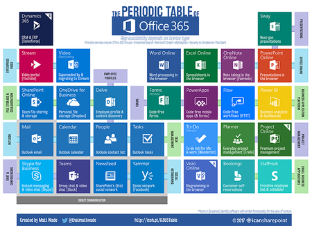 As Microsoft has moved users, teams, and documents to the cloud with Office 365, the company's IT department has been transforming from server and systems management to organization empowerment. Formerly MSIT and now called Core Services Engineering (CSE), the teams are focused on delivering technology based services that enhance the company's ability to achieve our mission: to empower every person and every organization on the planet to achieve more. Software-as-a-service solutions like Office 365 delivered from the cloud are always up to date and constantly improving. Rather than spend time racking and stacking servers, deploying patches, and planning costly upgrade projects, CSE resources are freed to develop solutions to business problems and enable a productive and collaborative - yet secure and protected - workforce. To learn more about MSIT's transformation aided by Office 365, check out the new white paper: http://aka.ms/MSITservers2services3.9KViews5likes0CommentsPeriodic Table of Office 365 is now dynamic and web-based