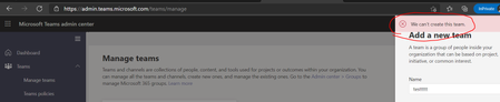 Hi, Last time was few days ago that I have created team without any issue in MS teams via Admin center. But now I get an error says «we can't create this team». I also got the same result with different name and different admin account. My privilege also looks good. also used different browsers. Any experience? any tips?6.6KViews0likes2CommentsMS teams Incoming Webhook Generating 400 to send Text Formats