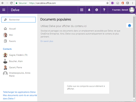 My Delve home page is empty with only a little zone saying something like «Nothing to display» (I am using french UI so this is my own translation). When the page loads, I briefly see some cards but they are replace with an empty screen. If I use the mobile app, I do see the cards I was seeing before. My URL changed to https://can.delve.office.com and I do not remember if the lost of content coincide but I think the timing of those changes is close. Am I alone?2.5KViews0likes4Comments