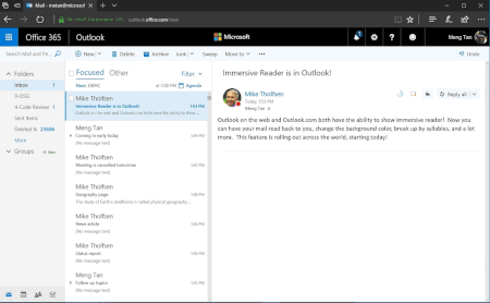 I received an email this morning reminding me of the impending end of support for the OneNote for Windows 10 app. As I do periodically when I am reminded about this, I launched the OneNote on Windows (OneNote M365) app and lamented how much less user friendly it is than its doomed cousin. The lack of a "Recent Notes" view is my biggest gripe, but the awkward "pop-over" search comes a close second. The tabs and search result are on an ugly grey background and everything is just slightly too small to read comfortably. Am I the only one?1.6KViews4likes22CommentsImmersive Reader comes to Outlook on the web and the OneNote for Windows 10 app...