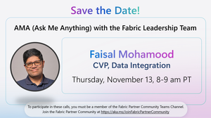 🚨 Mark your calendars now! 📅 New this year in the Fabric Partner Community, an AMA (Ask Me Anything) call series with members of the Fabric Leadership Team! 🥳 Kim Manis, CVP of Product Management, Microsoft Fabric Platform, will host the third call of this new call series Thursday, December 4, from 8-9 am PT. You will not want to miss this opportunity to ask all your platform related questions, provide your feedback, and more! 👏 To join theses calls, you must be a member of the Fabric Partner Community Teams Channel. Not yet part of the Fabric Partner Community? Join now by submitting the form at https://aka.ms/JoinFabricPartnerCommunity.7Views0likes0CommentsJoin the Fabric Partner Community for an AMA with Faisal Mohamood, CVP, Data Integration!