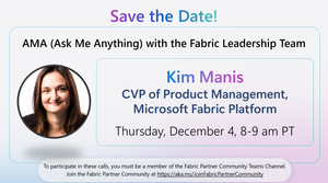 Are you a Microsoft partner that is interested in data and analytics? Be sure to join us for the next Fabric Engineering Connection calls! 🎉 Sujata Narayana will be sharing a recap of Power BI announcements from FabCon Europe, followed by the latest updates on AI Functions from Virginia Roman. The Americas & EMEA call will take place Wednesday, October 15, from 8-9 am PT and the APAC call is Thursday, October 16, from 1-2 am UTC/Wednesday, October 15, from 5-6 pm PT. This is your opportunity to learn more, ask questions, and provide feedback. To join the call, you must be a member of the Fabric Partner Community Teams channel. To join, complete the participation form at https://aka.ms/JoinFabricPartnerCommunity. We look forward to seeing you later this week!8Views0likes0CommentsJoin the Fabric Partner Community for an AMA with Kim Manis, CVP of Product Mgmt, Fabric Platform!