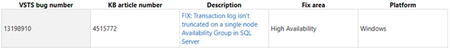 In March 2020 we introduced inline, short description of fixes in the master Cumulative Update KB articles. We call those descriptions “blurbs” and they replace many of the individual KB articles that existed for each product fix and contained brief descriptions. In other words, the same one-two sentence description that existed in a separate article before, now appears directly in the master CU KB article. For fixes that require longer explanation, provide additional information, workarounds, and troubleshooting steps, a full KB article is still created.5.1KViews1like0CommentsJuly 10, 2018 Windows updates cause SQL startup issues due to "TCP port is already in use" errors