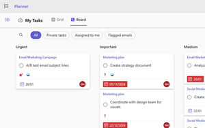 One of the most requested features from our customers, Board view in My Tasks, is now available in Planner. This feature is not only available in My Tasks but also in My Day, making it even easier for you to manage your tasks each day. The new view offers a more visual and organized way to manage your tasks, helping you stay on top of your priorities and improve your productivity. In this blog post, we'll dive into the benefits of Board view, show you how to use it, and share some real-life examples to help you get the most out of it. Whether you are managing personal tasks or working on a project, Board view aims to make your planning process smoother and more intuitive. What is Board view? Board view in My Tasks and My Day in Planner allows you to organize your tasks in a more visual and structured manner. Unlike Grid view, which presents tasks in a list format, Board view displays your tasks as cards grouped under columns on a board, providing a clear overview of your workflow at a glance. My Tasks in Planner presents all your private tasks, tasks assigned to you, and emails you’ve flagged in Outlook. Board view can help you stay on top of the tasks that matter, making it easy to focus on individual plans and your top priority tasks, as well as manage your workload to avoid taking on too much. In My Day, you can see your tasks due today and tasks you’ve added to your day from My Tasks. Using Board view helps you tackle those tasks in the way that works best for you, whether it’s focusing on one plan at a time, taking on your important tasks first, or staying on top of the tasks you’re already working on. Where to find it In My Tasks and My Day, you can easily switch between Grid view and Board view using the options in the header. How to use it When you are using Board view, you can change how the tasks are grouped into columns using the ‘Group by’ control. Board view enables you to group your tasks by: Plan: Including Private Tasks, Flagged emails, and each plan that includes tasks assigned to you. Progress: Not started, In progress, and Completed. Move tasks between columns to change their progress. Due Date: Late, Today, Tomorrow, This week, Next week, Future, and No date. Move tasks between columns to change their due date. Note: Due date of premium plan tasks cannot be changed from My Tasks and My Day. Priority: Urgent, Important, Medium, and Low. Move tasks between columns to change their priority. Note: Priority of premium plan tasks cannot be changed from My Tasks and My Day. Private tasks cannot be moved to ‘Urgent’. Top tips Use ‘Group by priority’ in My Tasks to stay on top of your most important tasks. Change priority by simply moving tasks between columns. Note: Priority of premium plan tasks cannot be changed from My Tasks and My Day. Private tasks cannot be moved to ‘Urgent’. Use ‘Group by Due date’ in My Tasks to view your most urgent tasks – quickly reschedule by moving tasks between columns. Note: Due date of premium plan tasks cannot be changed from My Tasks and My Day. Use ‘Group by plan’ in My Day to help you focus on one plan at a time. Use ‘Group by progress’ in My Day to limit how much you take on at a time – just move tasks between columns to mark them as in progress or complete. Try it out today Board view in My Tasks and My Day is available in the Planner app in Microsoft Teams and Planner for the web. Try it out today and let us know what you think! There are several ways to share your feedback with us—either via the Planner Feedback Portal or directly in the Planner app by selecting More (the questions mark) in the upper right corner, then Feedback. Resources Check out the Planner adoption page. Sign up to receive future communication about Planner. Check out the Microsoft 365 roadmap for feature descriptions and estimated release dates. Watch Planner demos for inspiration on how to get the most out of Planner. Watch the recording from September's What’s New and What’s Coming Next + AMA about the new Planner. Visit the Planner help page to learn more about the capabilities in Planner.51KViews4likes36Comments