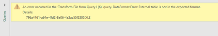 Need to convert data for a single person on one row with multiple columns into multiple rows for the same person plus each column of related data. Transpose does not work. Power Query might do the trick, but this is the first time using that tool. Any help is much appreciated! Here is the sample data to start with: Convert to:9.7KViews0likes9CommentsPower Query [DataFormat.error] External table not in expected format