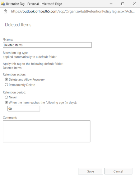 Dear Community, i tried to setup e-mail retention as needed by using Exchange Admin Center (classic version) and ran into a problem. What I want is all e-mail in all folders to be retained for 10 years, but deleted items to be removed after 90 days (deleted items folder and recovery folder together 90 days - whichever can be adjusted). For this, I created Retention tag as follows: But when I add this tag to "Default MRM policy" whic will be applied to mailboxes, somehow column "Type" remains empty, and I am not sure if this will work as intended or there is some kind of error? Also, I dont know how to setup recoverable items duration by using policy? Can someone suggest me what I should do? Thank you2.5KViews1like3CommentsRetention Policy and deletion