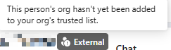 We have a B2B relationship with our parent company. They manage their own M365 we manage ours, but we added each others' domains as instructed in Cross-Tenant Access Settings and allowed access to each other's directory and calendar. However, on our Teams, their users pop up with a grey "external" badge stating "This person's org hasn't yet been added to your org's trusted list" even though Team's External Access Settings is set to Allow all External Domains, which means there is no trust list to begin with. Do the trusted domains have to be specified explicitly if so, is there a way to set this external domain as trusted without having to change "Allow all External domains" to "Allow only specific external domains"?3Views0likes0Commentsexternal calls with call queue or resource account.