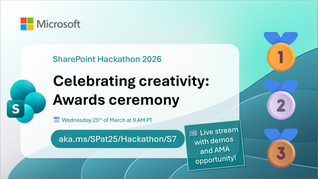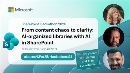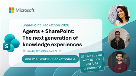 Join us for a practical live session exploring how agents in SharePoint and OneDrive help people interact with content in more natural, task‑focused ways. We’ll walk through live demos showing how agents are grounded in your files, lists, and libraries to answer questions, surface insights, and support everyday work across SharePoint sites and OneDrive. This session focuses on real scenarios, not theory. See how agents work with documents and content at scale, how they differ from traditional search and chat, and how they fit into the broader Microsoft 365 Copilot experience. What we’ll cover: Agents in SharePoint and OneDrive explained in simple terms Live demos working with real content How agents are grounded in your files and permissions Practical use cases for teams and organizations Ask Me Anything live with the product team Whether you manage SharePoint sites, work daily in OneDrive, or are curious about the future of AI‑powered content experiences, this live stream will give you a clear and practical view of what agents can do today and where they’re heading. 📺 Live discussion 💬 Q&A during the stream 🚀 Practical insights for modern SharePoint ✨ Presenters: Mithuna Soundararaj (Microsoft) Matt Wolodarsky (Microsoft) Akash Ravi (Microsoft) 🧑🤝🧑Hosts: Paolo Pialorsi (Microsoft) Vesa Juvonen (Microsoft) We are excited to invite you to the SharePoint Hackathon 2026, dedicated to crafting engaging experiences using AI and the latest SharePoint features! 💡 Learn more about the SharePoint Hackathon, including official rules, full stream schedule, and more: https://aka.ms/SPat25/Hackathon98Views0likes0CommentsSharePoint Hackathon 2026