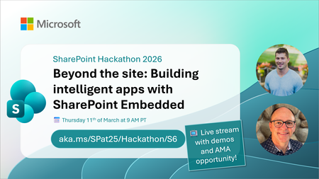Join us for a special live stream celebrating the creativity, innovation, and community spirit of the SharePoint Hackathon 2026. In this session, we announce the top 3 submissions across all hackathon categories, highlighting solutions that showcase what’s possible with modern SharePoint, AI, agents, SPFx, and SharePoint Embedded. We will also recognize special community awards, created to acknowledge outstanding contributions, learning, and sharing during the hackathon. This is a moment to celebrate not just winning solutions, but the collective energy, creativity, and collaboration of the global SharePoint community. What to expect: Top 3 announcements for each SharePoint Hackathon 2026 submission category Special recognitions for community impact and creativity Highlights from standout solutions and approaches A celebration of “sharing is caring” in action Whether you submitted a solution, followed the sessions, or supported others along the way, this stream is about celebrating the people and ideas that move SharePoint forward together We are excited to invite you to the SharePoint Hackathon 2026, dedicated to crafting engaging experiences using AI and the latest SharePoint features! 💡 Learn more about the SharePoint Hackathon, including official rules, full stream schedule, and more: https://aka.ms/SPat25/Hackathon.78Views0likes0CommentsBeyond the site: Building intelligent apps with SharePoint Embedded | SharePoint Hackathon 2026
