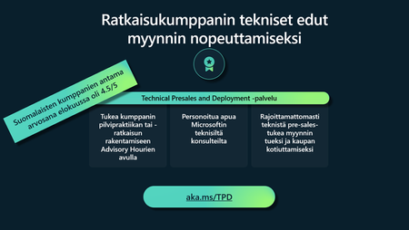 Most RecentMost ViewedMost LikesTPD-palvelusta RAJOITTAMATTOMASTI teknistä pre-sales-apua Yksi hyödyllisimmistä kumppanieduista on TPD eli Technical Pre-sales and Deployment -palvelu. Ota käyttöön! Technical Presales and Deployment -palvelu kumppaneille Hyödynnä maksuttoman TPD-palvelun tekniset edut ja nopeuta myyntiprosessiasi.